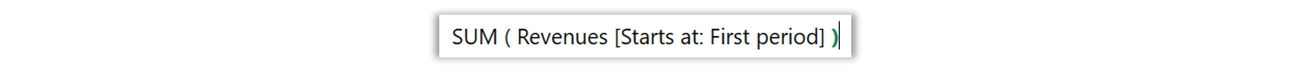 The above example calculates the cumulative revenues since the beginning of the Model. In this case, the Time Range for the Revenues Variable starts at the first period of the model, and ends at the current period.