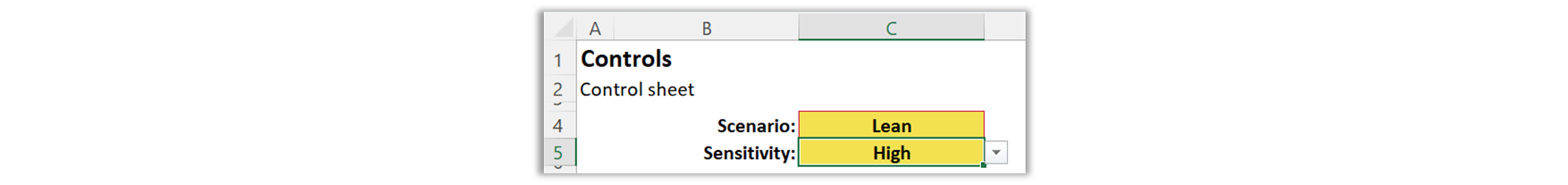 One Sheet in the Model must display the dropdown controls for selecting the active Scenario and Sensitivity, as shown below.