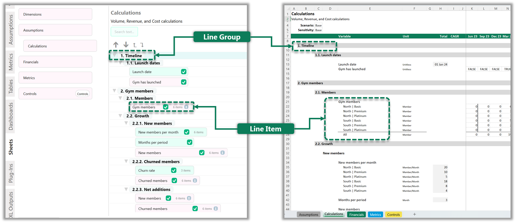 Line Groups and Line Items in Models (left) and Excel (right)