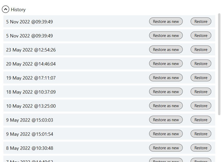 The History panel shows you all available previous versions of the Model, with the date and time at which they were created. For each version, you have the option to **Restore as new**, or **Restore**.